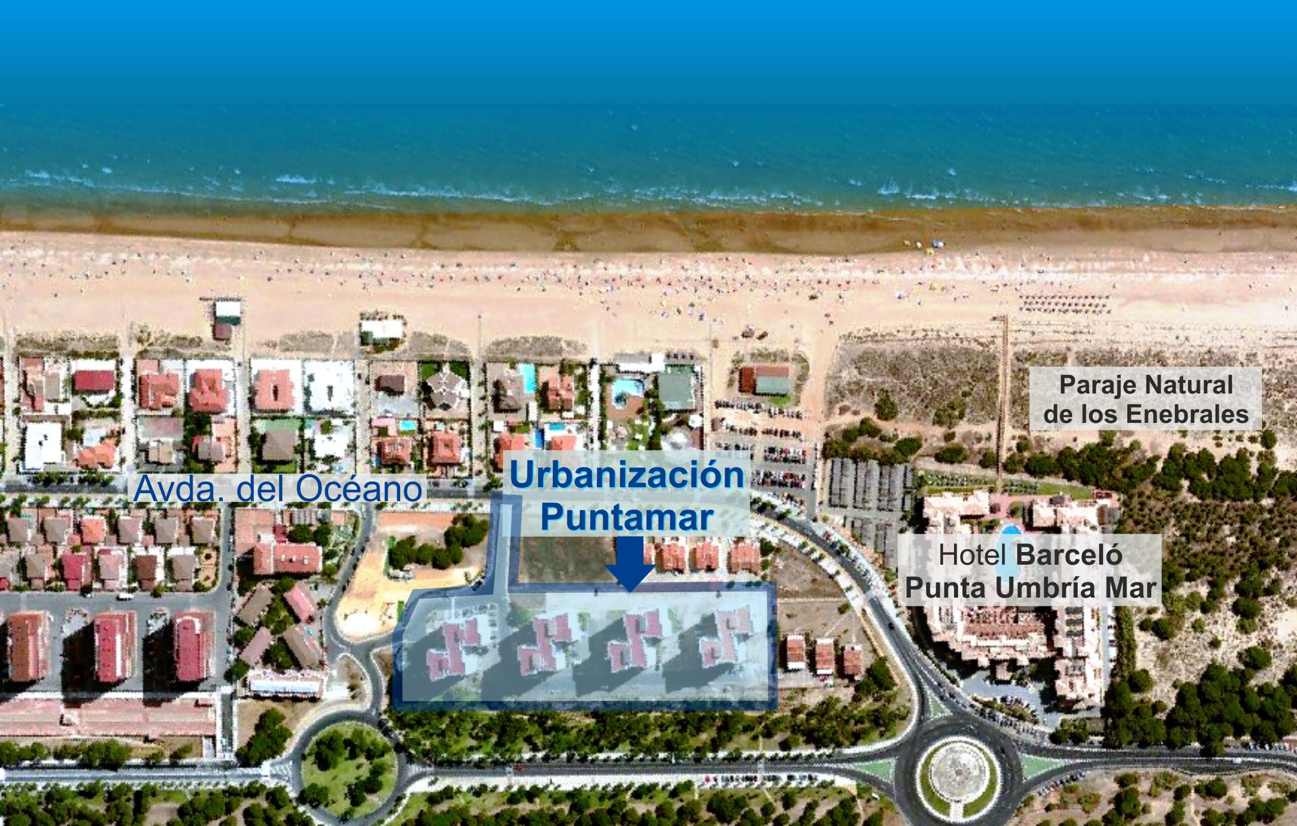 La vivienda está situada a escasos metros de la playa, en la urbanización Puntamar, en la Avenida del Océano de Punta Umbría, junto al Hotel Barceló Punta Umbría Mar y a la playa de Los Enebrales, declarada Paraje Natural.La urbanización Puntamar cuenta con algunas zonas ajardinadas y aparcamiento para residentes.Con acceso andando a la playa de Los Enebrales, los amantes de la tranquilidad, el descanso y el contacto directo con la naturaleza, encontrarán en ella sin duda su playa ideal y soñada.